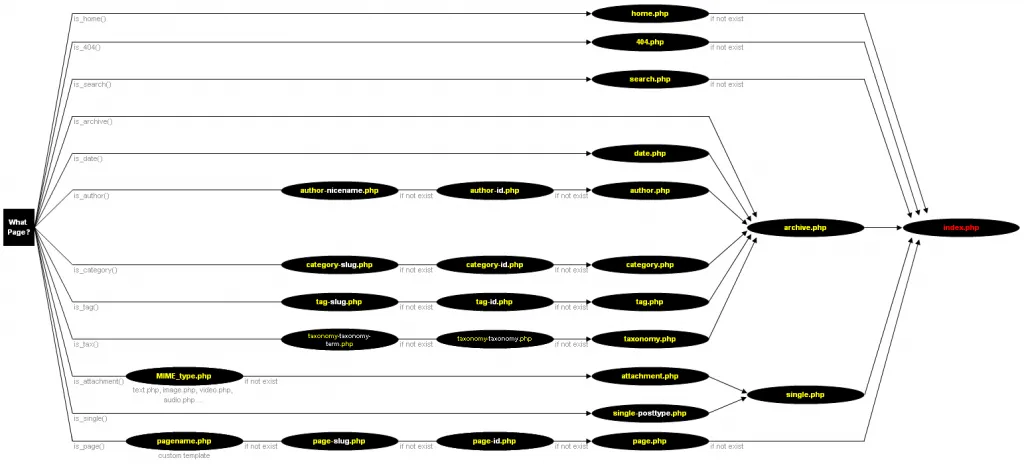 Par exemple, pour afficher la page d’accueil, WordPress va d’abord chercher le fichier home.php. Si ce fichier n’existe pas, il utilisera index.php. Pour afficher un article, il utilisera dans l’ordre single-[type].php (où [type] est un type d’article), ou single.php, ou index.php. Pour des informations plus précises, je vous conseille cet article de la documentation officielle, ainsi que cette très bonne infographie proposée par Erwan ;). Wordpress cherchera toujours du fichier le plus spécifique au plus général : index.php. Du coup, et heureusement, vous n’êtes pas obligés de fournir tous ces fichiers pour avoir un thème fonctionnel ;).